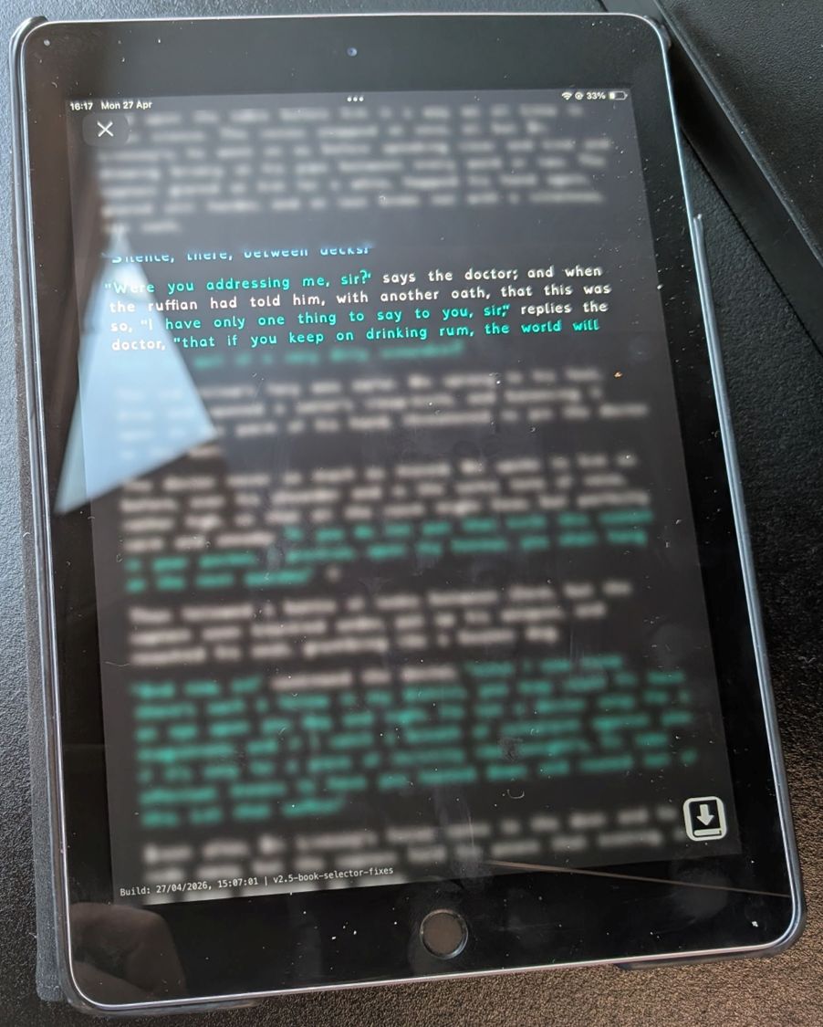 My earlier plan was to keep the source ebook material entirely clean - and then provide a set of supporting content (JSON files with chapter analysis, music files and additional graphics). The idea being that in the future this would be an add-on pack for ebooks that you already own. That proved cumbersome for colour-coding the dialogue - so to simplify that I’ve embedded within the original text.
