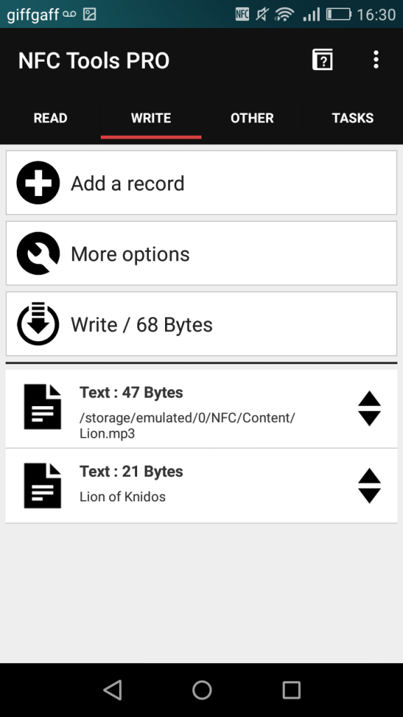 There are a number of android applications that let us write data to NFC cards. My favourite is ‘NFC Tasks’ by Wakdev. There is a free and a pro version.